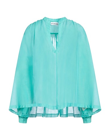 top, woven, solid color, no appliqués, v-neck, long sleeves, hand wash or dry clean, do not bleach, do not tumble dry, this brand runs large