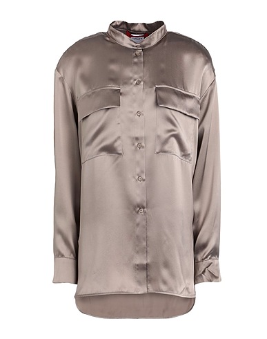 satin, no appliqués, solid color, mandarin collar, long sleeves, buttoned cuffs, button fastenings, two breast pockets, contains non-textile parts of animal origin, do not dry clean, do not tumble dry, do not bleach, safari shirt