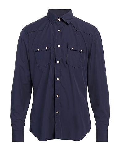 safari shirt, poplin, solid color, brand logo, classic collar, long sleeves, snap-fastening cuffs, snap fastenings, two chest pockets, machine wash or dry clean, do not bleach, do not tumble dry