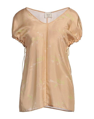 top, satin, floral-print, no appliqués, v-neck, short sleeves, gathered sleeves, dry clean, do not bleach, do not tumble dry