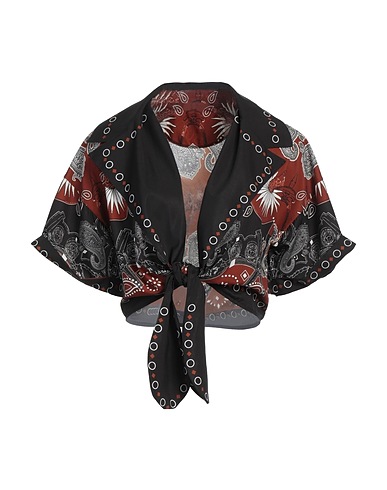 top, satin, paisley-print, cropped, lapel collar, short sleeves, tie fastening, hand wash, do not bleach, do not tumble dry, do not iron