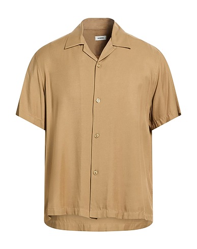 regular-fit shirt, twill, solid color, no appliqués, camp collar, short sleeves, button fastenings, dry clean, do not bleach, do not tumble dry