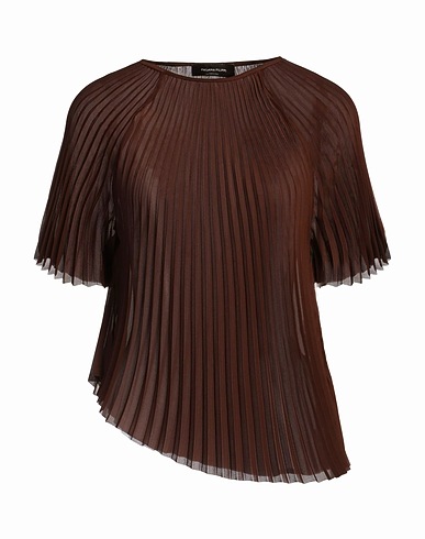 top, crepe, solid color, pleated, crewneck, short sleeves, asymmetric hem, dry clean, do not bleach, do not tumble dry