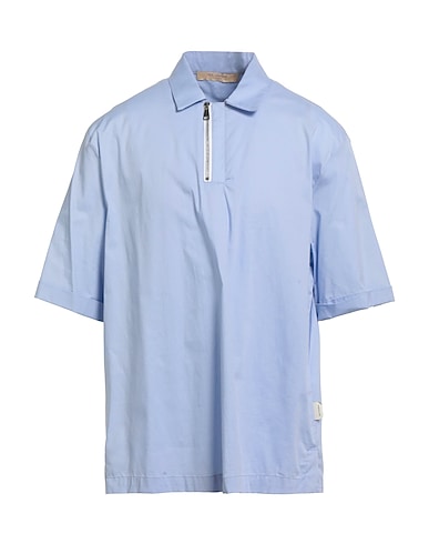 regular-fit shirt, woven, stretchy fabric, solid color, brand logo, half-zip neckline, short sleeves, side slit hemline, hand wash or dry clean, do not bleach, do not tumble dry