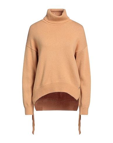 knitted, lightweight knit, fringes, brand logo, solid color, turtleneck, long sleeves, side slit hemline, hand wash, do not bleach, do not tumble dry
