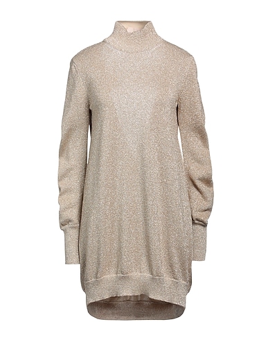 dress, knitted, lightweight knit, metallic, solid color, no appliqués, turtleneck, long sleeves, unlined, without pockets, dry clean, do not bleach, do not tumble dry, this brand runs large