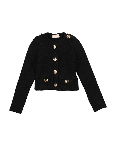 chenille, knitted, medium-weight knit, solid color with appliqués, tabs, long sleeves, button fastenings, faux pockets, hand wash or dry clean, do not bleach, do not tumble dry