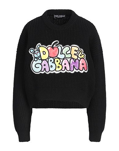 wool, medium-weight knit, solid color with appliqués, brand logo, crewneck, long sleeves, dry clean, do not bleach, do not tumble dry