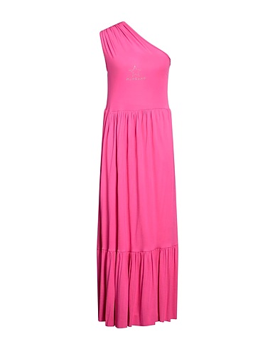 jersey, metal applications, brand logo, solid color, deep neckline, one-shoulder, unlined, no pockets, trapeze style