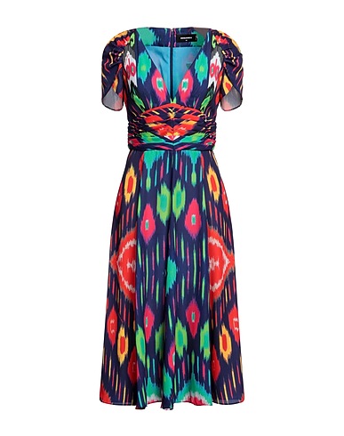 crepe, folds, ethnic design, deep neckline, short sleeves, partially lined interior, zipper closure, no pockets, trapeze style, small sized