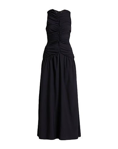 flared dress, jersey, solid color, gathered, v-neck, sleeveless, unlined, without pockets, stretch, machine wash or dry clean, do not bleach, do not tumble dry