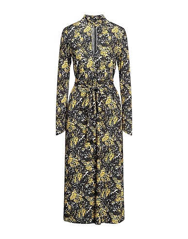 synthetic jersey, belt, multicolor pattern, mandarin collar, long sleeves, unlined, 1 button, no pockets, stretch, dress
