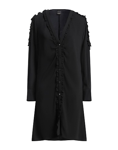 shirt dress, crepe, solid color, ruffles, deep neckline, long sleeves, buttoned cuffs, unlined, button fastenings, multipockets, machine wash or dry clean, do not bleach, do not tumble dry
