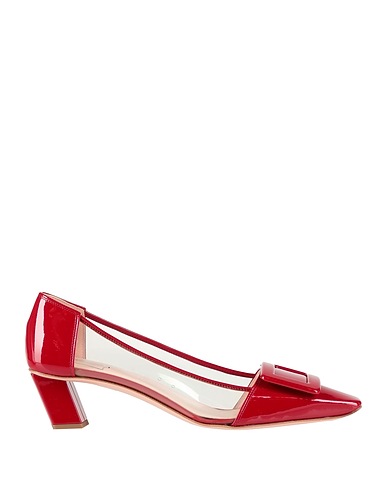 leather, varnished effect, breathable fabric, brand logo, solid color, unlined, narrow toeline, square heel, leather sole, contains non-textile parts of animal origin, pumps