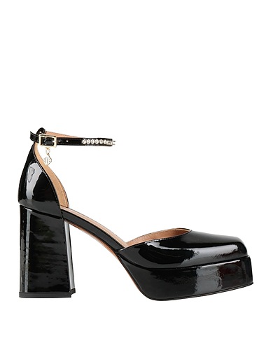 pumps, leather, patent-effect, solid color, no appliqués, leather lining, buckle-fastening ankle strap, square toe, square heel, leather sole, contains non-textile parts of animal origin