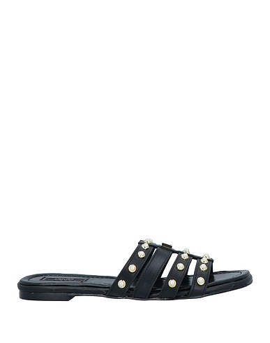 leather, brand logo, contrasting applications, solid colour with appliqués, leather backing, square toeline, flat, leather sole, contains non-textile parts of animal origin, slide sandals