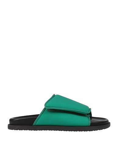slide sandals, woven, solid color, no appliqués, fabric inner, velcro fastening, round toe, flat, rubber sole