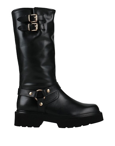 pebbled-leather, strap detailing, solid color with appliqués, fully lined, round toe, square heel, lug sole, contains non-textile parts of animal origin, chunky boots