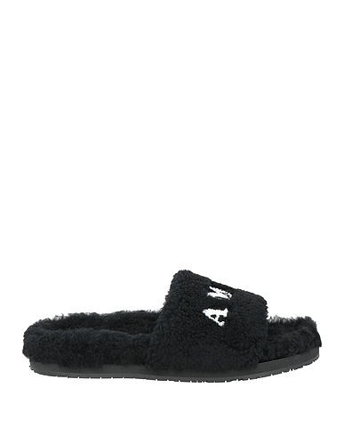 slide sandals, shearling, bouclé, solid color, brand logo, lined in shearling, round toe, flat, rubber cleated sole, contains non-textile parts of animal origin