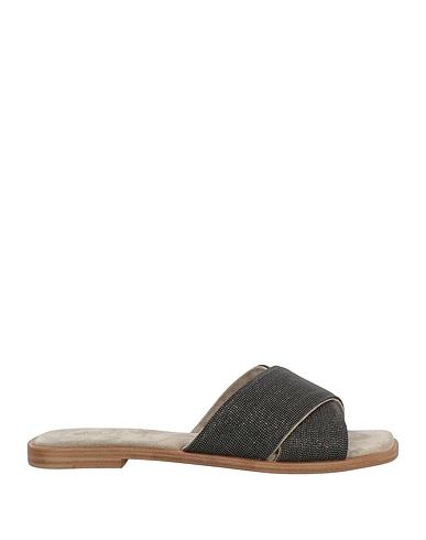 slide sandals, leather, embellished, solid color, leather lining, round toe, flat, leather/rubber sole, contains non-textile parts of animal origin