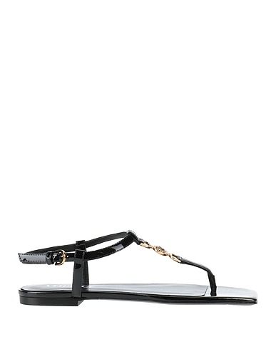 thong sandals, patent leather, solid color, brand logo, buckle fastening, square toe, flat, rubber sole, leather lining, contains non-textile parts of animal origin