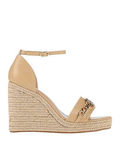 espadrille sandals, coated fabric, solid color with appliqués, embellished, fully lined, buckle-fastening ankle strap, round toe, wedge heel, rubber sole