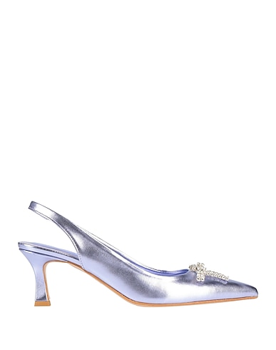 slingback pumps, coated fabric, metallic, solid color with appliqués, bow-detailed, fully lined, elasticized inserts, pointed toe, spool heel, covered heel, rubber sole