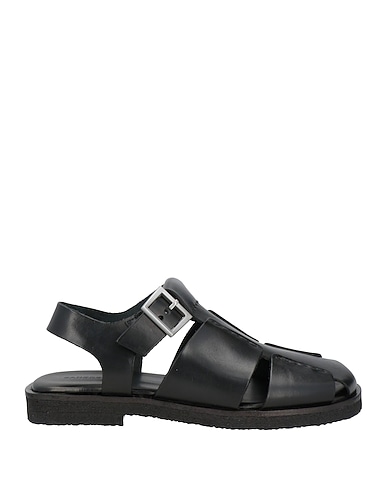 fisherman sandals, leather, solid color, no appliqués, leather lining, buckle-fastening ankle strap, round toe, flat, rubber sole, contains non-textile parts of animal origin