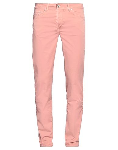 twill, brand logo, solid color, mid rise, belt loops, tapered leg, slim-leg pants, button closing, five pockets, stretch, contains non-textile parts of animal origin, 5 pocket