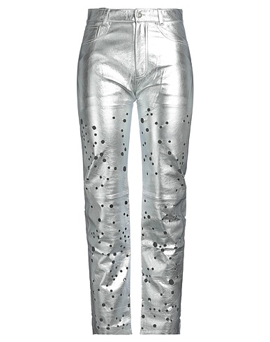 leather, openwork, laminated effect, no appliqués, solid color, high waisted, tapered leg, regular fit, zipper closure, 1 button, multipockets, contains non-textile parts of animal origin, 5 pocket