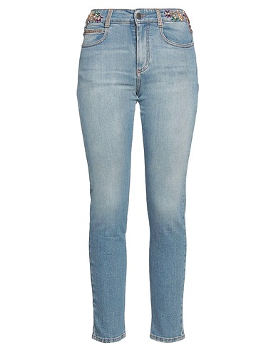 denim, faded, rhinestones, brand logo, solid color, light wash, mid rise, tapered leg, slim-leg pants, zipper closure, button closing, multipockets, stretch, skinny model