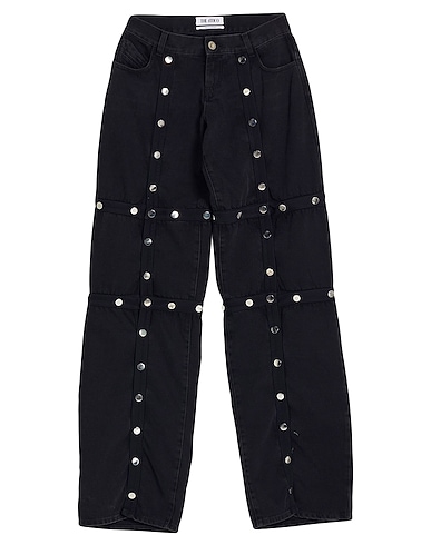 straight-leg jeans, denim, solid color with appliqués, brand logo, studs, colored wash, mid rise, regular fit, zipper fastening, button fastenings, multipockets, hand wash, do not bleach, do not tumble dry