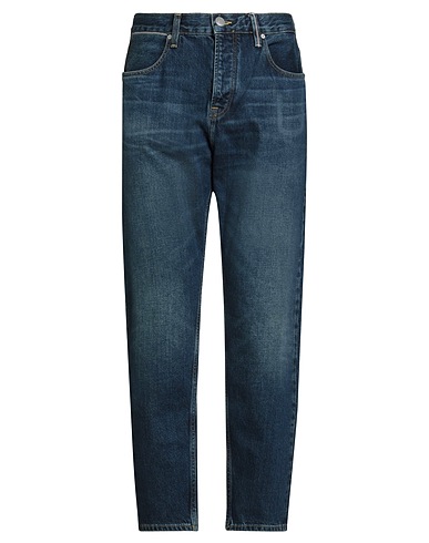 tapered jeans, denim, faded, solid color, brand logo, studs, medium wash, high waisted, regular fit, button fastenings, five pockets, machine wash or dry clean, do not bleach, do not tumble dry