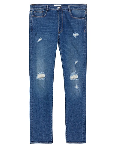 skinny jeans, denim, faded, distressed, solid color, brand logo, studs, medium wash, mid rise, slim fit, 1 button, zipper fastening, machine wash, do not bleach, do not tumble dry