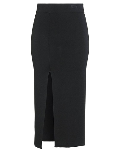 flared skirt, knitted, lightweight knit, solid color, no appliqués, elasticized waist, unlined, front slit, machine wash or dry clean, do not bleach, do not tumble dry