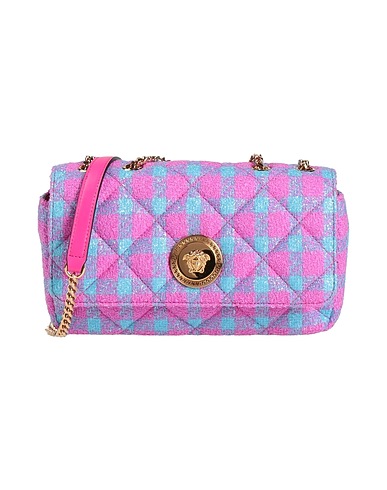 flap bag, bouclé, tweed, checked, brand logo, snap fastenings, fully lined, external side zip pockets, medium size, contains non-textile parts of animal origin