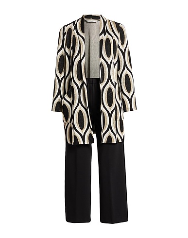 pants set, knitted, metallic, lightweight knit, multicolor, no appliqués, lapel collar, single-breasted , long sleeves, unlined, multipockets, elasticized waist, stretch, dry clean, do not bleach, do not tumble dry