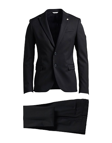 single-breasted suit, twill, solid color, brooch, lapel collar, long sleeves, buttoned cuffs, fully lined, button fastenings, zipper fastening, multipockets, dual back vents, mid rise, stretch, dry clean, do not bleach, do not tumble dry
