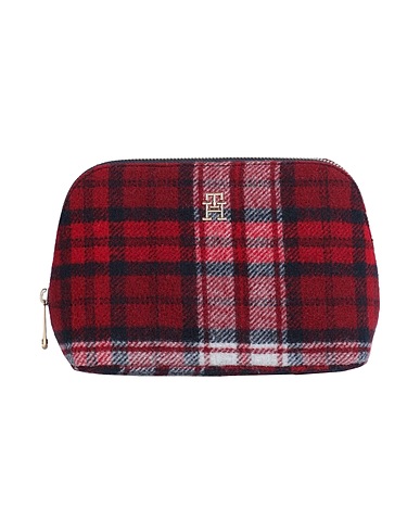 felt, brand logo, tartan pattern, internal pocket, zipper closure