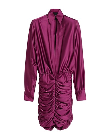 Modell Hemdblusenkleid, Satin, Mit Stretch-Anteil, einfarbig, Mit Raffung, Klassischer Kragen, lange Ärmel, Mit Schulterpolstern, ungefüttert, Reißverschluss, Verschluss mit Häkchen, Ohne Taschen, Das ideale Outfit für Ihre Partys, das Stil, Eleganz und einen Hauch von Glamour vereint