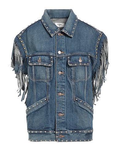 Jeansweste, Denim, Einfarbig mit Applikationen, Fransen, Nieten, Mittlere Waschung, Klassischer Kragen, Einreiher, ärmellos, Knopfverschluss, viele Taschen, Chemische Reinigung, nicht Bleichen, Trockner ungeeignet