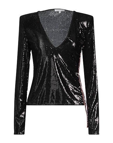 top, mesh fabric, solid color with appliqués, sequins, brand logo, v-neck, long sleeves, shoulder pads, unlined, stretch