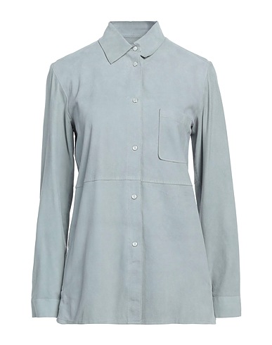 shirt, suede, solid color, no appliqués, classic collar, long sleeves, unlined, snap fastenings, one chest pocket, contains non-textile parts of animal origin, do not wash, do not bleach, do not tumble dry