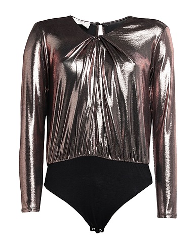 crepe, laminated effect, detachable application, brand logo, solid color, v-neck, long sleeves, crotch of body, stretch