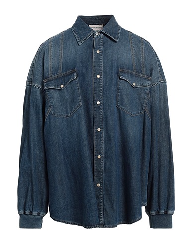 denim, faded, solid color, brand logo, dark wash, classic collar, long sleeves, ribbed cuffs, snap fastenings, two chest pockets, this brand runs large