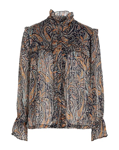 ruched shirt, crepe, metallic, ruffles, paisley-print, mandarin collar, long sleeves, elasticated cuffs, button fastenings, without pockets, dry clean, do not bleach, do not tumble dry