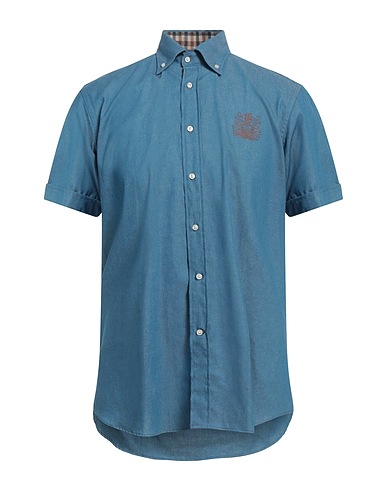 regular-fit shirt, woven, denim effect, solid color, embroidered logo, button-down collar, short sleeves, button fastenings, machine wash or dry clean, do not bleach, do not tumble dry, this brand runs small