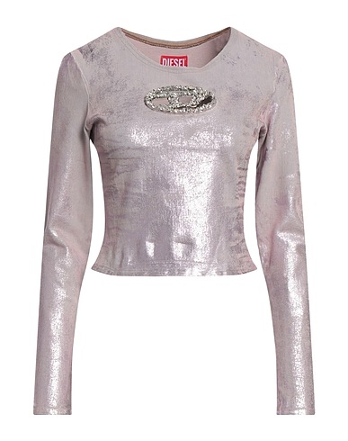 top, denim, metallic, solid color with appliqués, crystals, brand logo, colored wash, crewneck, long sleeves, stretch, machine wash, tumble dry