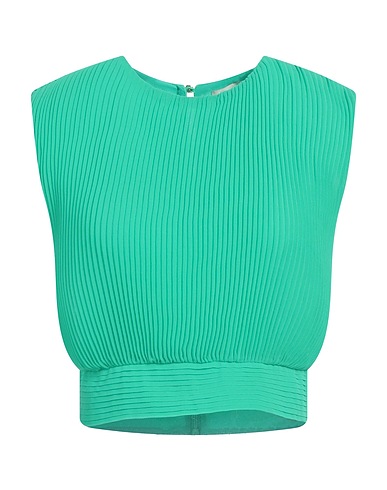 top, crepe, solid color with appliqués, pleated, brand logo, crewneck, sleeveless, hand wash or dry clean, do not bleach, do not tumble dry