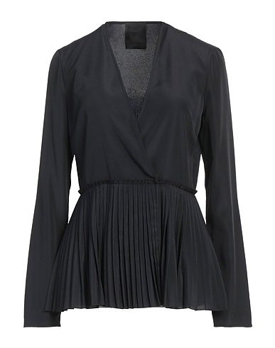 wrap top, satin, solid color, pleated, deep neckline, long sleeves, button fastenings, dry clean, do not bleach, do not tumble dry